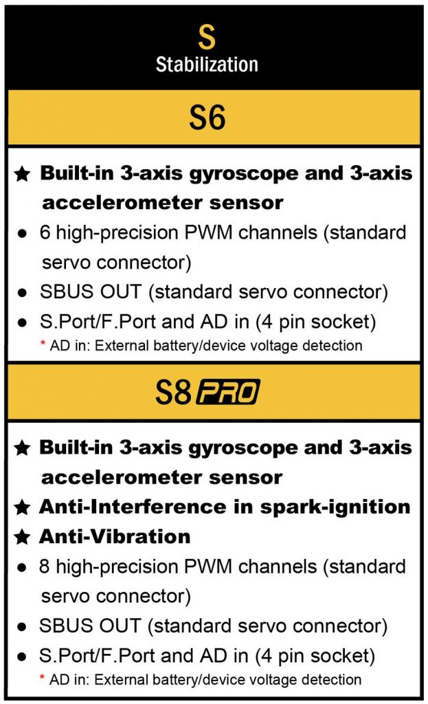 Frsky Archer S6 and S8Pro are the upgraded S6R and S8R receivers with built in stabilisation.
