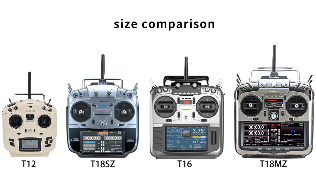 The T16 radio for sure does not feel as toy. It weights 888 798 grams and is bigger than Jumper T12 – the size of T16 is 180x190x58mm (Jumper T12 – 158x150x58mm, Taranis X9D – 195x185x70mm).