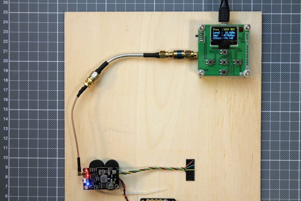Connected the TX805 to the RF power meter via supplied MMCX pigtail. VTX was actively cooled with fan while taking the measurements.