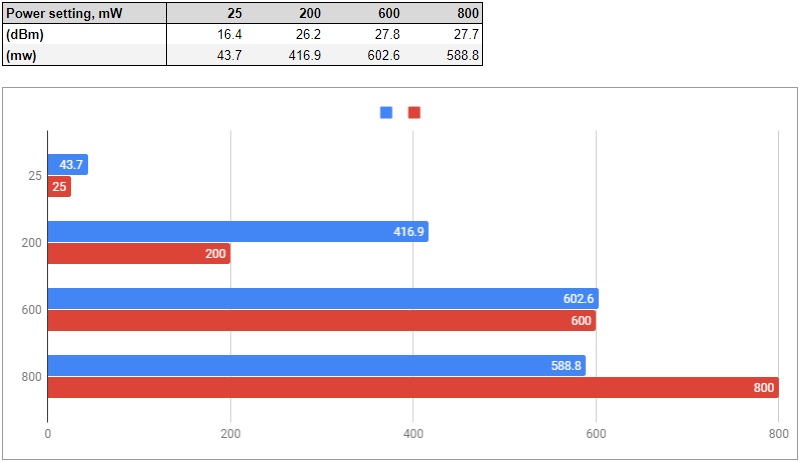 And at max setting of 800mW it outputs even less than 600mW, only 598 mW (27.7d Bm)!